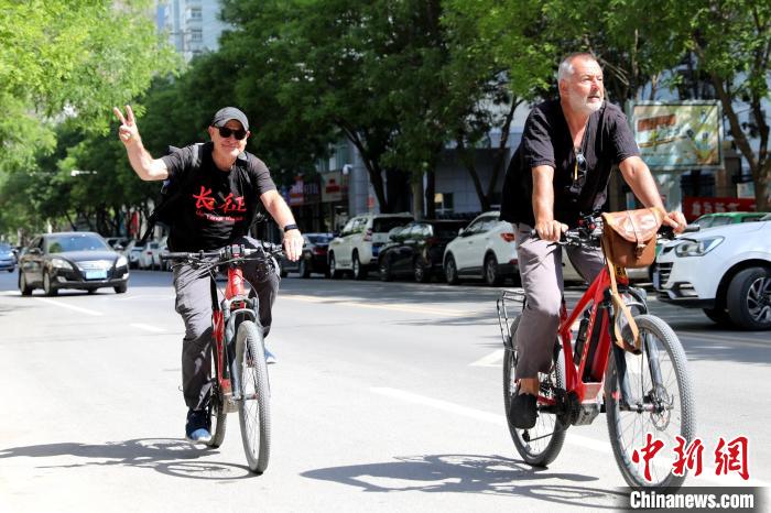 圖為柯立思(左)與福爾克騎行在志丹縣街頭。張遠(yuǎn) 攝