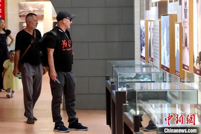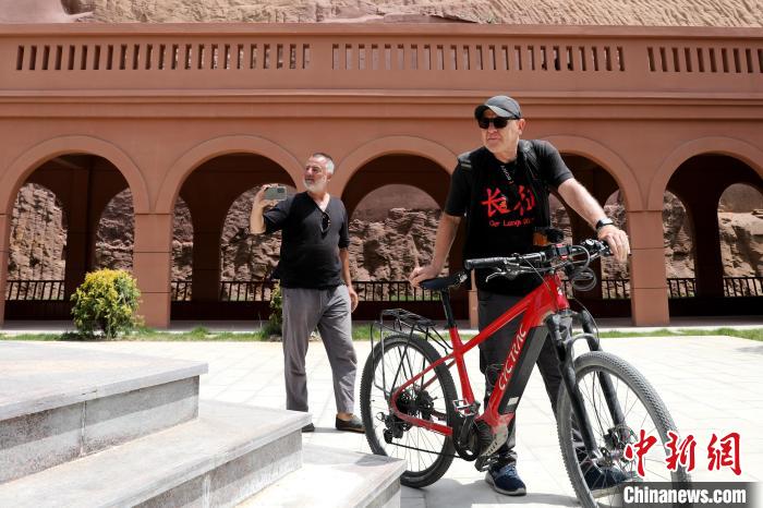 中新網(wǎng)記者18日在延安市志丹縣見到了柯立思與福爾克,此時的他們正準(zhǔn)備前往劉志丹烈士陵園與保安革命舊址參觀。柯立思身穿黑色T恤,上面印有“長征”二字。福爾克指著略帶泥濘的助力自行車告訴福爾克:“車胎外側(cè)破了,必須盡快修理,電瓶也不行了。”