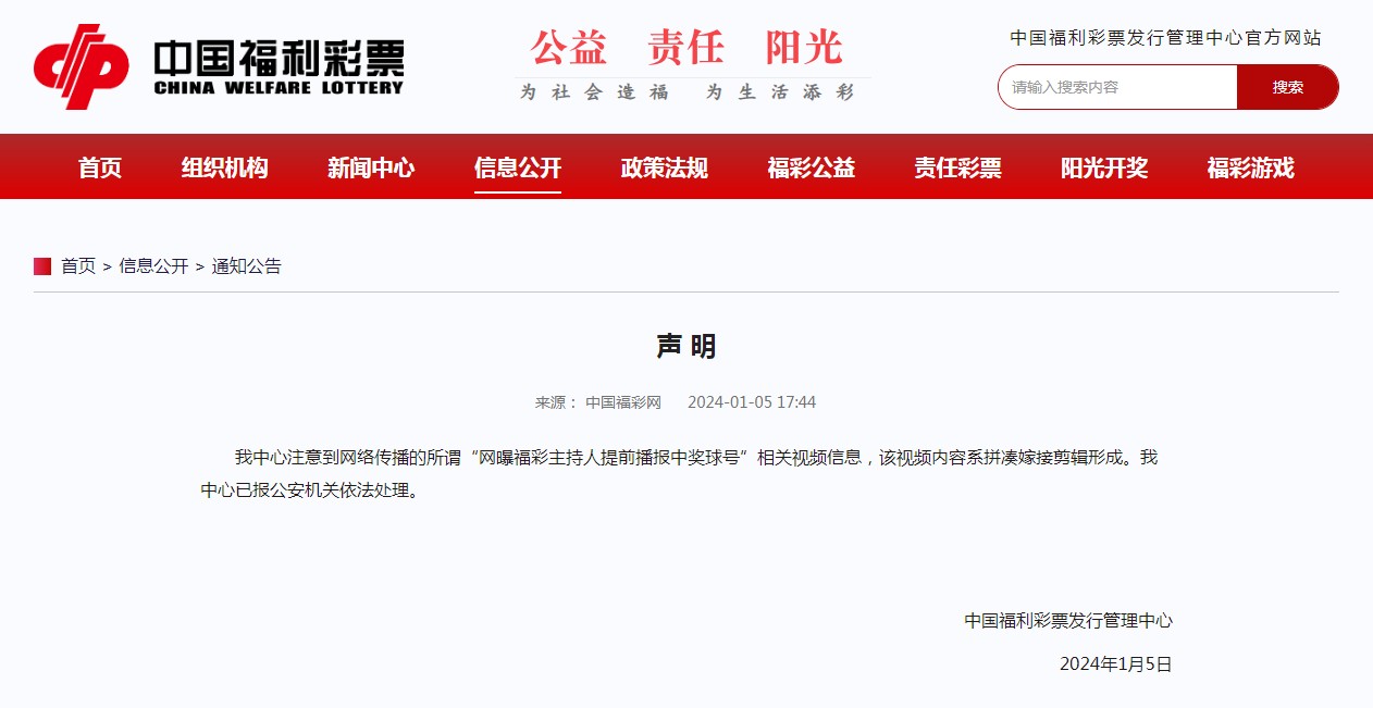 5日,中國(guó)福利彩票發(fā)行管理中心官方網(wǎng)站刊發(fā)聲明稱,中國(guó)福利彩票發(fā)行管理中心注意到網(wǎng)絡(luò)傳播的所謂“網(wǎng)曝福彩主持人提前播報(bào)中獎(jiǎng)球號(hào)”相關(guān)視頻信息,該視頻內(nèi)容系拼湊嫁接剪輯形成。中國(guó)福利彩票發(fā)行管理中心已報(bào)公安機(jī)關(guān)依法處理。