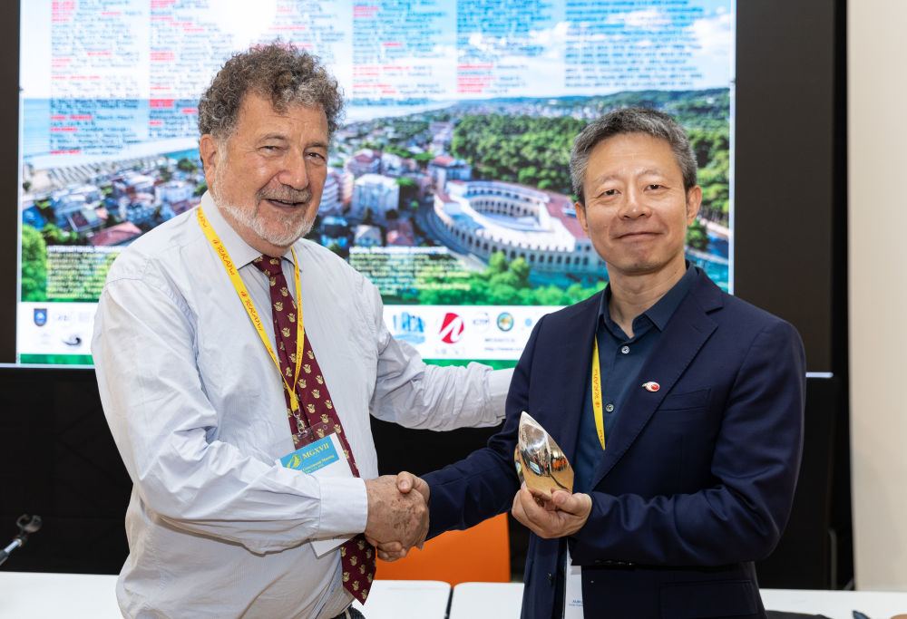 2024年7月9日,在意大利佩斯卡拉,會(huì)議主辦方之一、國(guó)際相對(duì)論天體物理中心網(wǎng)絡(luò)主任雷莫·魯菲尼(左)為李菂頒獎(jiǎng)。新華社記者 李京 攝