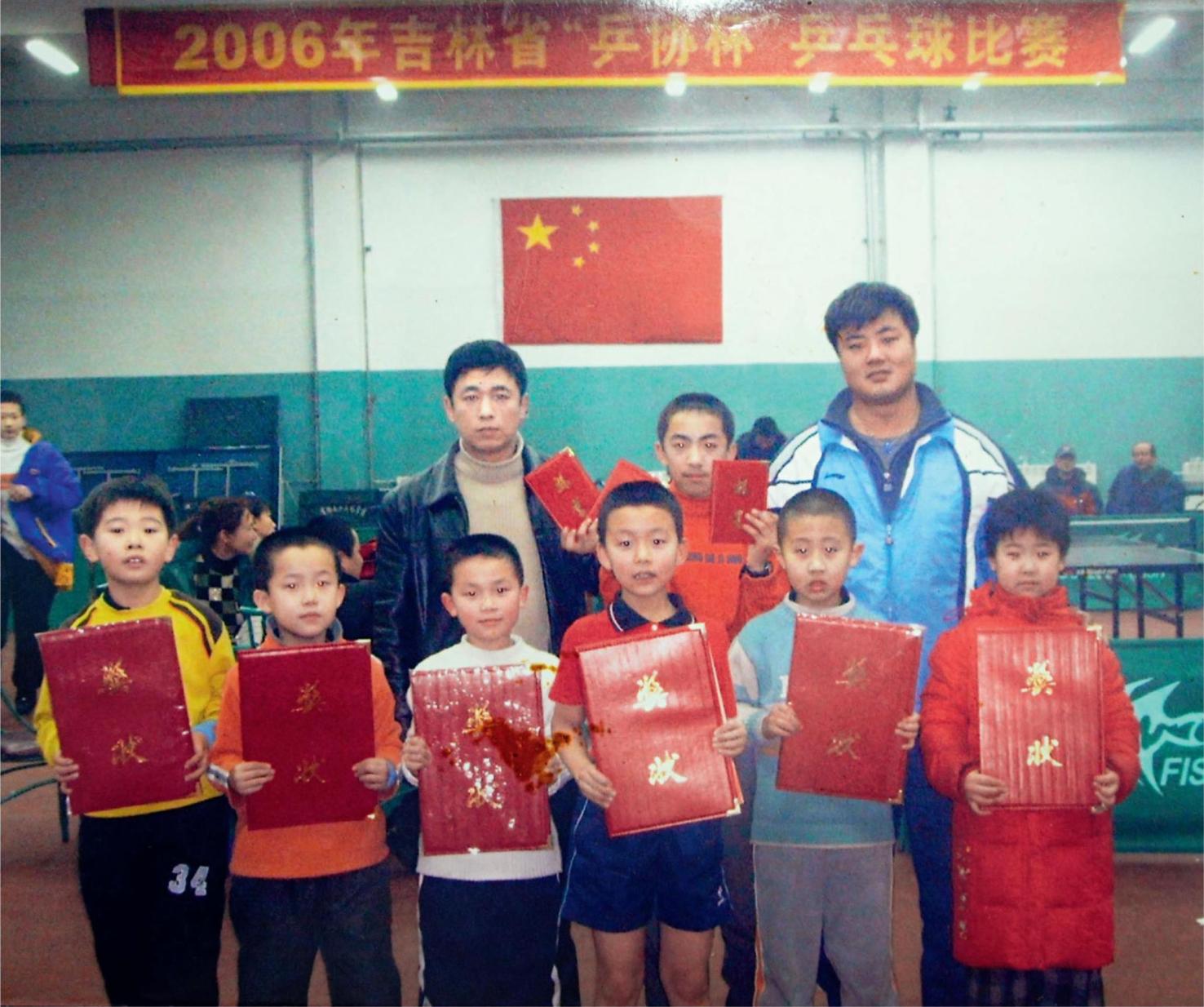 王楚欽(前排左二)在2006年吉林省“乒協(xié)杯”乒乓球比賽中獲獎。后排左一為關(guān)志國。