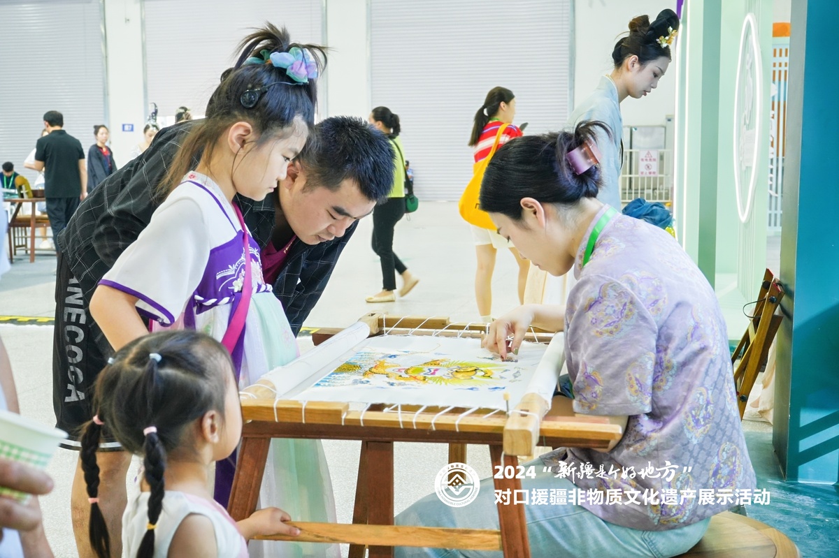 “新疆是個好地方”對口援疆非物質(zhì)文化遺產(chǎn)展示活動已在新疆連續(xù)成功舉辦3屆,成為鑄牢中華民族共同體意識的重要文旅品牌。今年主會場匯聚了新疆、兵團和其他21個省市共300余個非遺代表性項目、400余位非遺代表性傳承人,“多彩非遺”“指尖非遺”“樂舞非遺”“非遺集市”“非遺研學(xué)”等活動板塊集中展現(xiàn)新疆和援疆省市非遺保護交流合作成果。各省市展廳各具特色,各美其美,而浙江主題展廳以其獨特創(chuàng)意、唯美設(shè)計、江南韻味獨樹一幟,成為全場的爆點,觀眾川流不息,來自浙江金華的非遺傳承人也被媒體競相采訪報道。