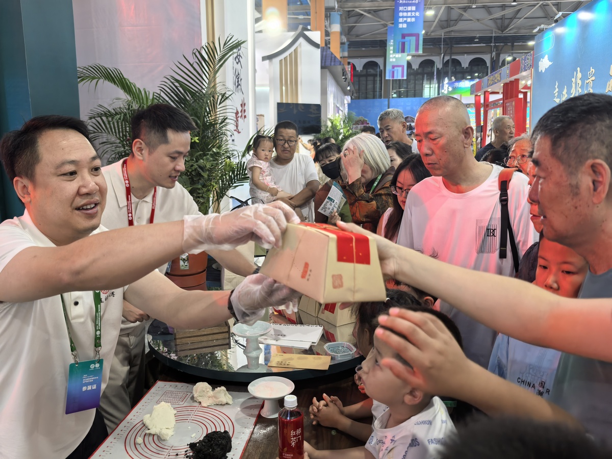 看罷非遺秀演,觀賞非遺精品,步出浙江展廳,品嘗一盞婺州舉巖茶宋代點茶技藝傳承人送上的茶湯,再配上一塊樓師傅現(xiàn)場制作的婺式糕點,口有余香、回味無窮,“能不憶江南”。