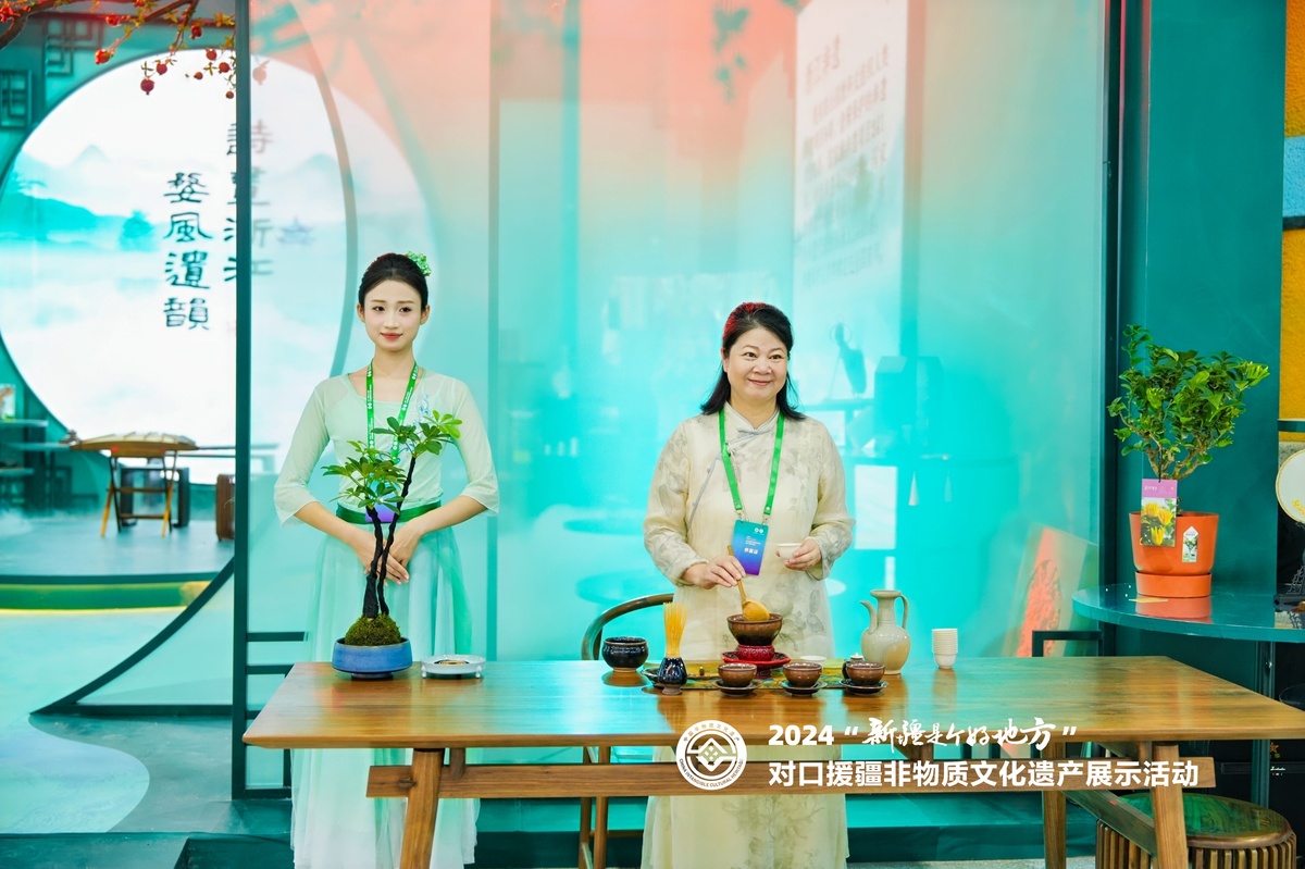 非遺在浙江,根深葉茂,薪火相傳,光彩照人。此次浙江主題展區(qū)著重以金華非遺為代表,展出了富有古婺特色的婺劇、婺州舉巖、婺州窯陶瓷燒制技藝、東陽木雕、竹編、錫雕、鑄鐵技藝、金華火腿等56個項目112件非遺精品,包括1個人類非遺項目,12個國家級非遺項目,東陽木雕《粒粒同心》、武義棕編《我家的石榴紅了》、磐安竹編《圓緣》、浦江十字花《浙疆石榴紅》等20件新創(chuàng)主題作品,不僅展示了金華非遺近年來在保護傳承和創(chuàng)新發(fā)展過程中取得的成果,更表達了濃濃浙疆情。婺劇《掛畫》《跳魁星》《小和尚下山》、民間舞蹈《烏龜端茶》、民間競技《大力士摔跤》等非遺項目展演則展示了古婺金華文化之盛、非遺之美。“匠心同行”非遺交流匯以匠心為初心,以匠藝為誠意,讓非遺傳承人結(jié)識同道、交流技藝,探討新知、賦能發(fā)展。東陽木雕、傳統(tǒng)婺式糕點制作技藝、東陽針刺無骨花燈、浦江十字花等非遺代表性傳承人相繼走進直播間,分享傳承非遺、創(chuàng)新發(fā)展之道,錫雕、婺州舉巖茶宋代點茶技藝、婺繡、東陽中國結(jié)等非遺傳承人現(xiàn)場展示技藝,帶游客觀眾沉浸式體驗,很受歡迎,婺繡傳承人吳方希蔓、浦江十字花傳承人何明園和巴州的蒙古刺繡傳承人現(xiàn)場交流,切磋技藝,增進友情,為鑄牢中華民族共同體意識發(fā)揮積極作用。