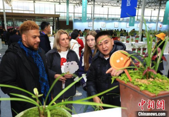 蘭農(nóng)(右一)向國際友人介紹春蘭。錢光祥 攝