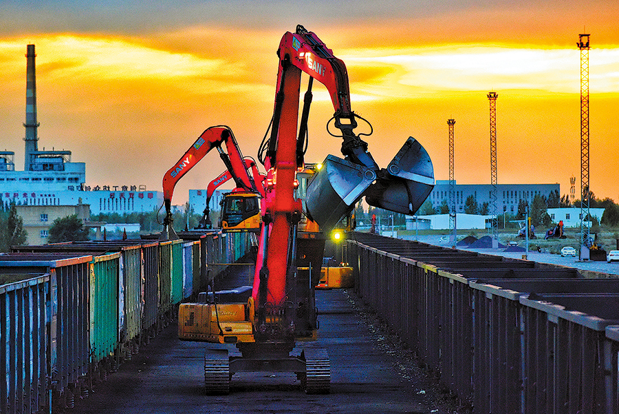 Material handlers load freight containers at Horgos Station, Sept 6, 2023.[Photo by Bai Fengliang/For China Daily]