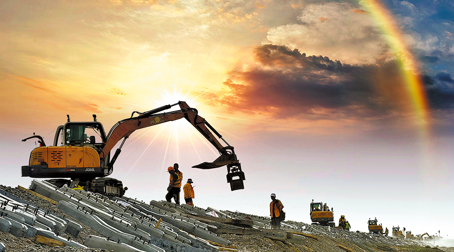 Workers press ahead with the Kuqa-Aksu line expansion project, July 18, 2019.[Photo by Bai Fengliang/For China Daily]