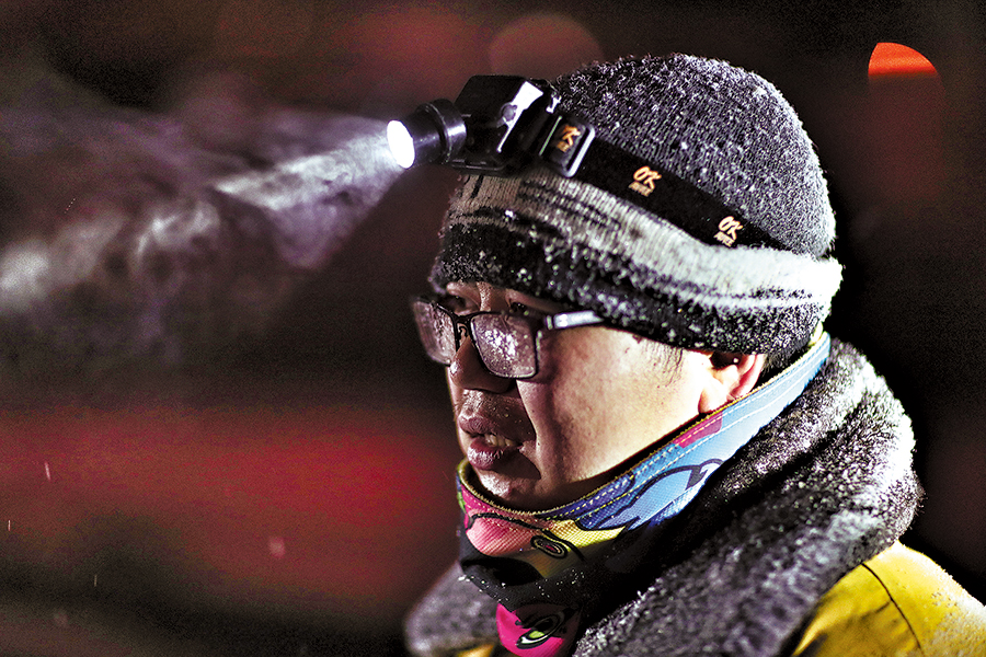 Railway workers operate overnight in heavy snow at Urumqi Railway Station, Dec 5, 2018.[Photo by Bai Fengliang/For China Daily]