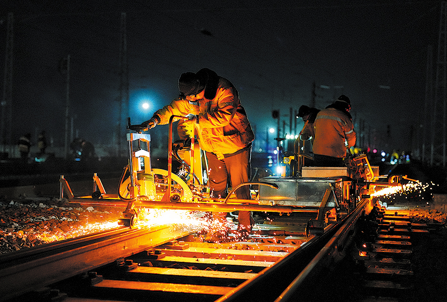 Rail grinding in progress at Hami East Station, Feb 19, 2025.[Photo by Bai Fengliang/For China Daily]