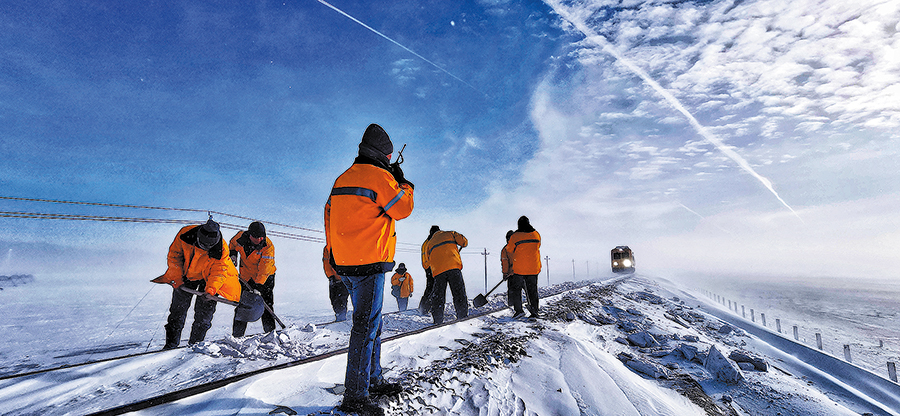 Track workers assist the "Bumblebee" snowplough to clear wind-blown snow near Tiechanggou Station, Jan 19, 2020.[Photo by Bai Fengliang/For China Daily]