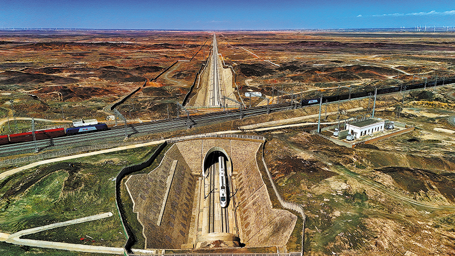A high-speed train in Lanzhou-Urumqi High-speed Railway passes through an underpass as two freight trains cross overhead near Jingxia Station, Sept 24, 2024.[Photo by Bai Fengliang/For China Daily]