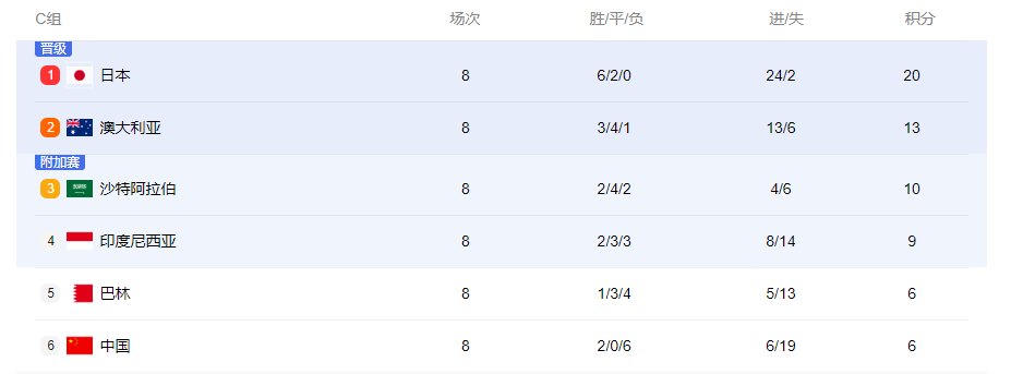 在目前的積分榜上,國(guó)足與巴林同積6分,但因凈勝球的劣勢(shì)排名小組墊底。國(guó)足落后第4名印尼3個(gè)積分,若想保留晉級(jí)希望必須在6月5日客場(chǎng)擊敗印尼后,于6月10日主場(chǎng)戰(zhàn)勝巴林,同時(shí)需寄望沙特、日本等隊(duì)“幫忙”阻擊同組內(nèi)競(jìng)爭(zhēng)對(duì)手。